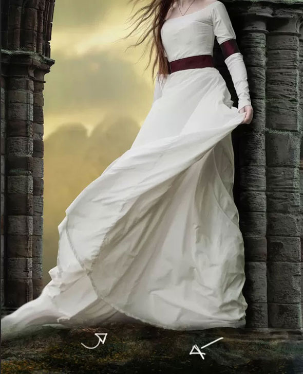 Создайте новый слой между слоями колонн и модели. Растушеванной кистью большого размера на низком уровне непрозрачности черного цвета нарисуйте тень для модели.