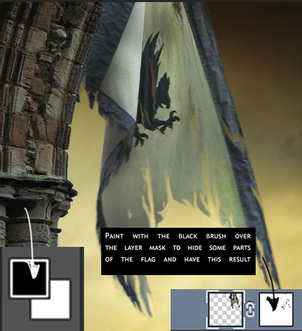 Возьмите маленьку кисть черного цвета и закрасьте в слое-маске флага некоторые места, чтобы создать порванные края и дырки.