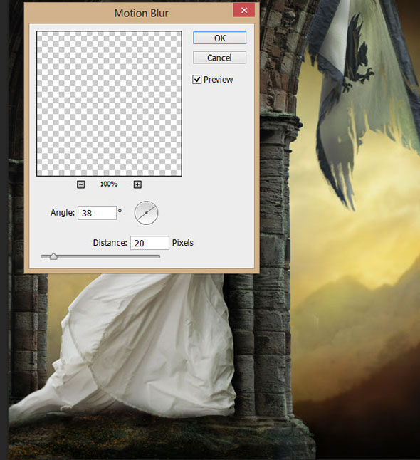 Повторите то же со вторым флагом. Теперь примените ко второму флагу (тому что подальше) Motion blur (размытие в движении) (Filter > Blur > Motion Blur / Фильтр > Размытие > Размытие в движении). Выберите угол в 38 и дистанцию в 20px.
