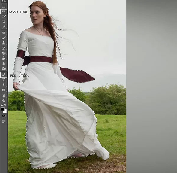 Используйте инструмент Pen tool (Перо) или Lasso tool (Лассо), чтобы выделите модель с фона.