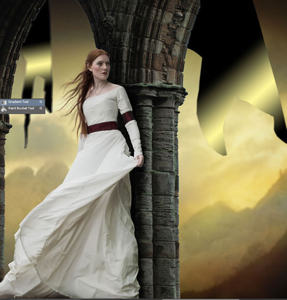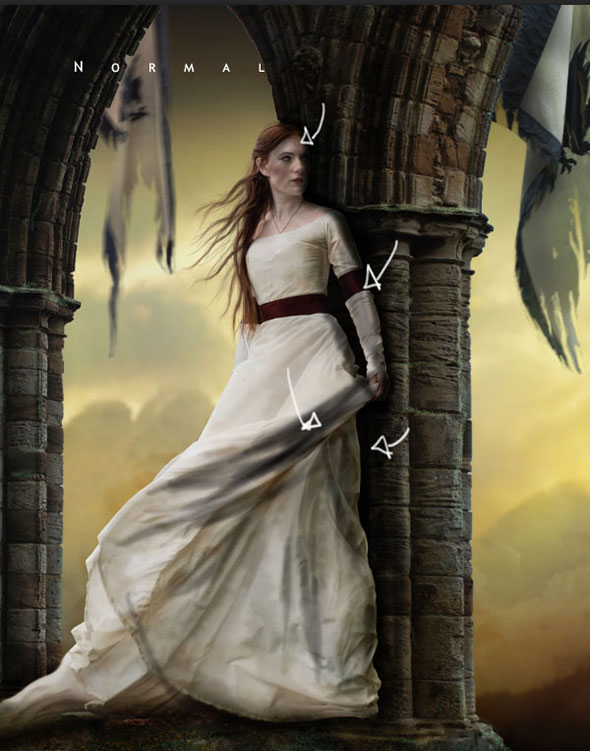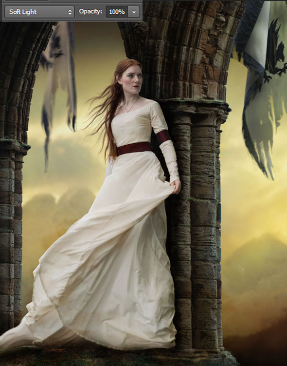 Создайте новый слой. Возьмите кисть светлого желтого цвета и рисуйте ею по краям флагов и колонн, чтобы создать свет. Смените режим наложения и снизьте непрозрачность до 50%.