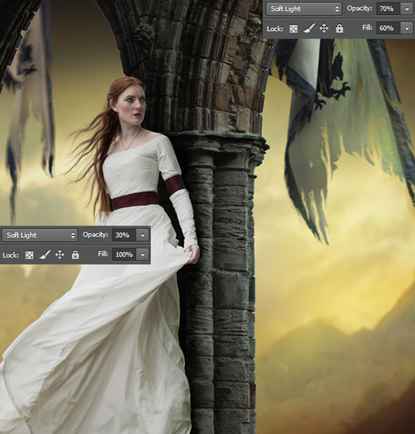 Смените режим наложения слоев на soft light (мягкий свет). Для первого флага укажите непрозрачность в 70% и заливку (fill) — в 60%. А для второго только непрозрачность (opacity) в 30%.