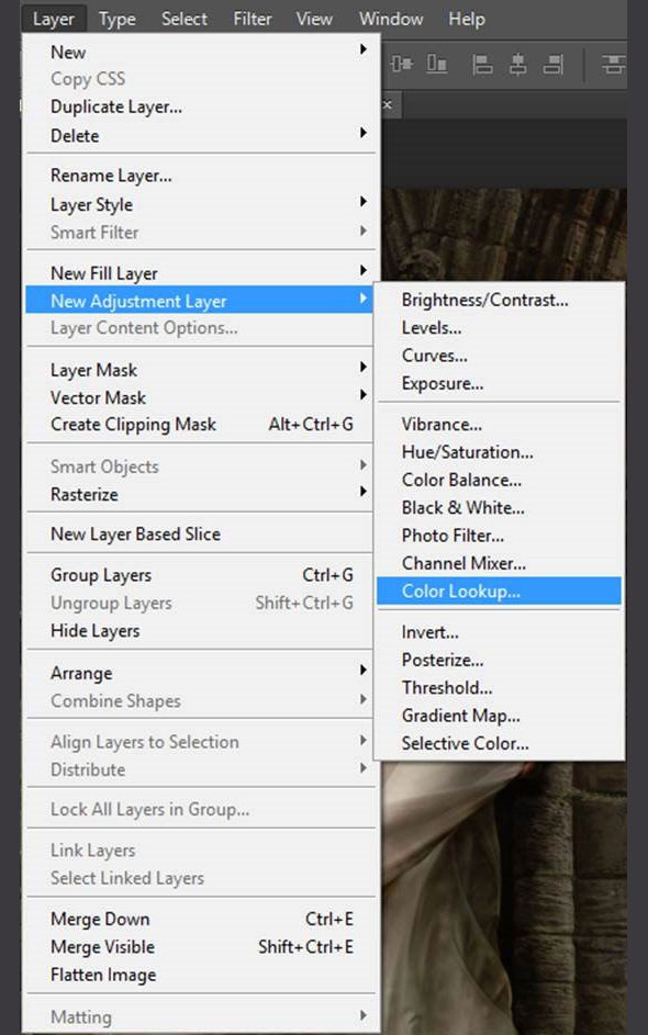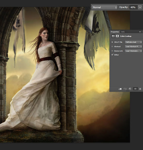 Создайте новый корректирующий слой поверх остальных: Layer > New Adjustment Layer > Color Lookup / Слой > Новый корректирующий слой > Поиск цвета. Выберите вариант «fall colors» и снизьте непрозрачность слоя до 40%.