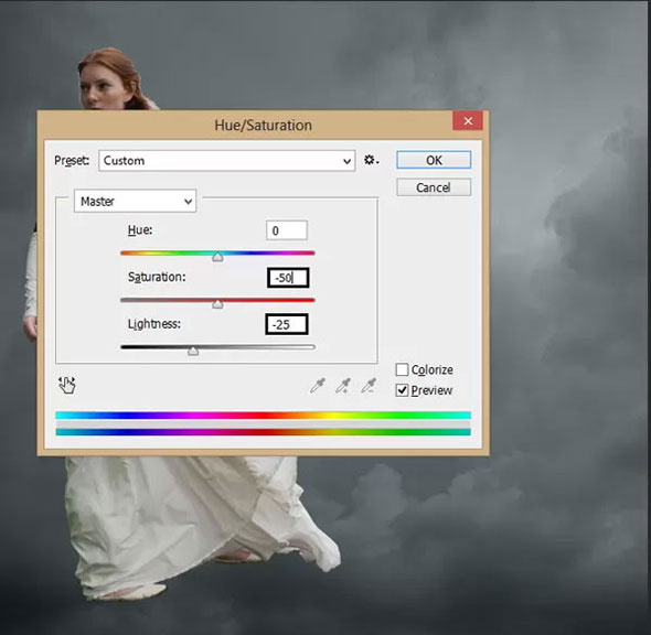 Нажмите Ctrl+U. В появившемся окне укажите Saturation (Насыщенность) в -50 и Lightness (Яркость) в -25.