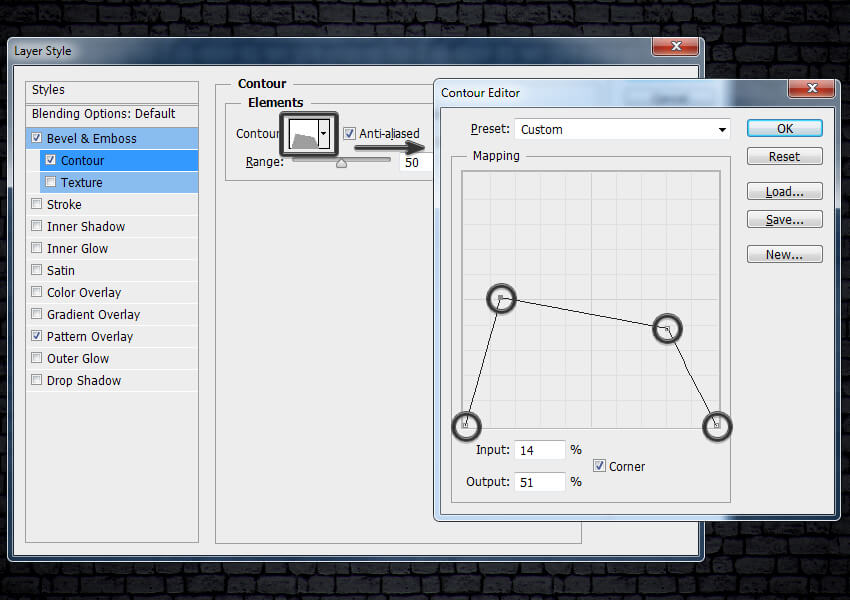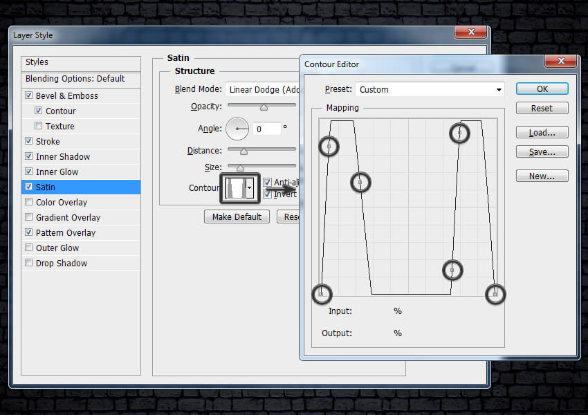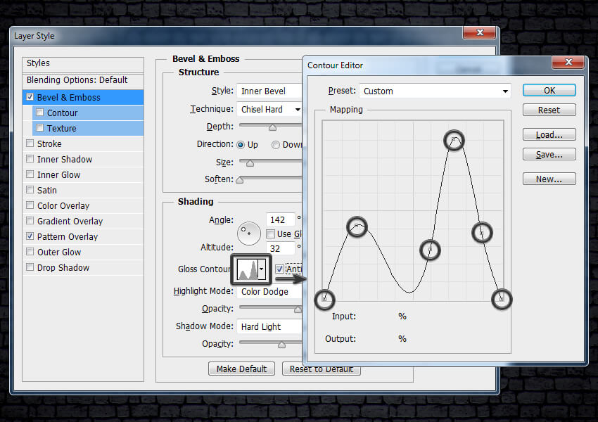 По прежнему остаемся в стиле Bevel & Emboss/тиснение. Нам нужно создать свой Gloss Contour/Контур блеска. Повторите кривую как на картинке ниже. Если вы хотите повторить контур один в один, вот расположение точек: