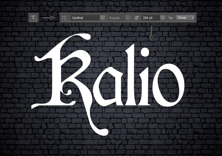 Инструментом Type/Текст введите ваш текст, используя шрифт Cardinal. Укажите размер шрифта в 354 pt. В нашем примере мы будем работать со словом Kalio.