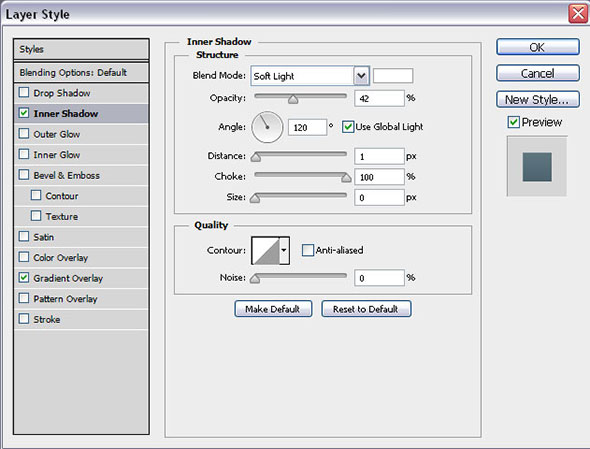 Добавим нашему фону некоторые настройки, чтобы придать ему глубину. Перейдите в меню Слои – Стиль слоя (Layer- Layer Styles) или просто два раза кликните по слою, и добавьте следующие параметры: