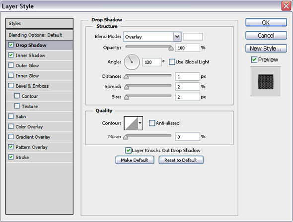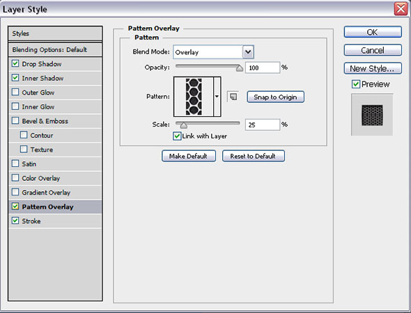 Откройте его в Photoshop/ выберите Редактировать->Определить узор (Edit->Define Pattern) и назовите его как-нибудь. (Либо можете скачать паттерн здесь и установить его в Photoshop). Кликните два раза по слою, чтобы открыть его стили.