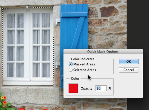 Это очень удобная функция для внесения изменений в выделенную область. Для входа в режим быстрой маски нужно нажать на кнопку в нижней панели инструментов, или клавишу Q. Аналогичным способом можно выйти с режима. После того, как вы зашли в режим быстрой маски, вы увидите, что выделенная область осталась без изменений, а остальная часть изображения закарешно в красный цвет. Изменить настройки можно кликнув два раза по значку быстрой маски. Для создания нужных выделений, в этом режиме вы должны работать с градиентами и кистями. Использования черного как окновного цвета переднего плана даст возможность удалить область из выделения, использование белого поможет увеличить выделение.