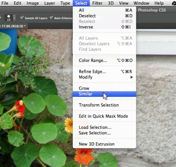 Magic Wand (Волшебная палочка) является классическим инструментом Photoshop. Он позволяет создавать выделение на основе сходства соседних пикселей. Инструмент Quick Selection (Быстрое выделение) скрыт в панели инструментов и чем-то похож на Magic Wand (Волшебную палочку). Этот инструмент принимает форму кистей, и с помощью простого мазка вы можете создать нужную выделенную область. Название инструментов смежные пиксели (grow) и подобные оттенки (similar) говорит само за себя.