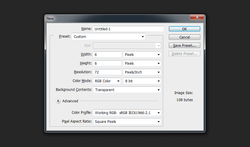 Откройте Photoshop и в меню выберите File > New/Файл>Создать. Создайте документ размером 6 x 6 px с настройками как показано ниже.