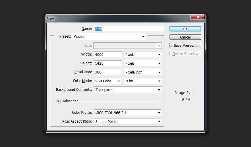 Создайте новый документ размером 4000 x 1420 px с параметрами как показано ниже.