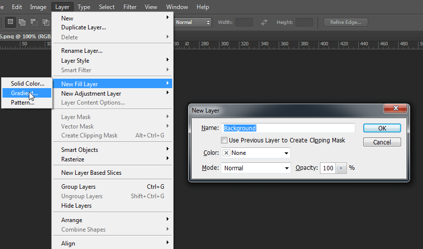Выберите в меню Layer > New Fill Layer > Gradient/Слой>Новый слой-заливка>Градиент. Назоваите слой Background.
