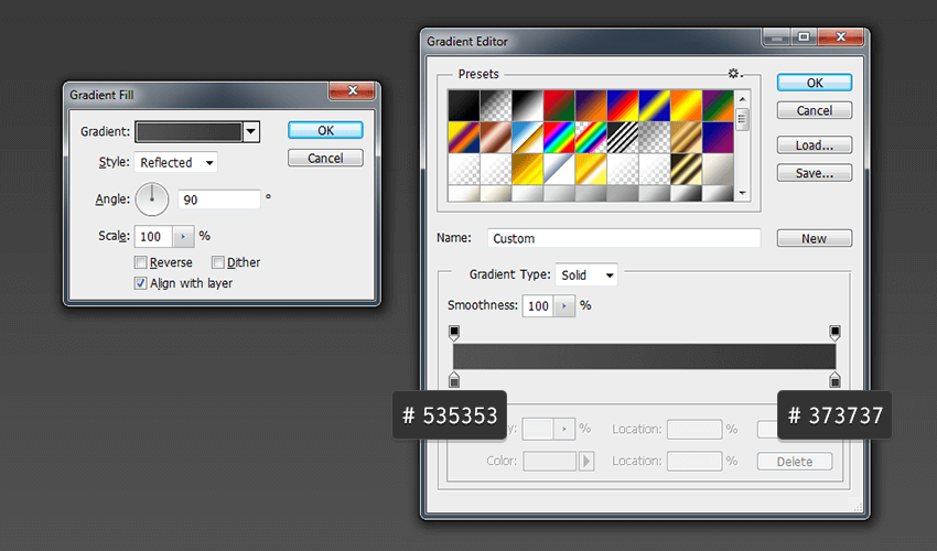 Photoshop откроет новое диалоговое окно. Кликните по градиенту, чтобы его отредактировать. Укажите переход цвета от #535353 к #373737. Нажмите OK.