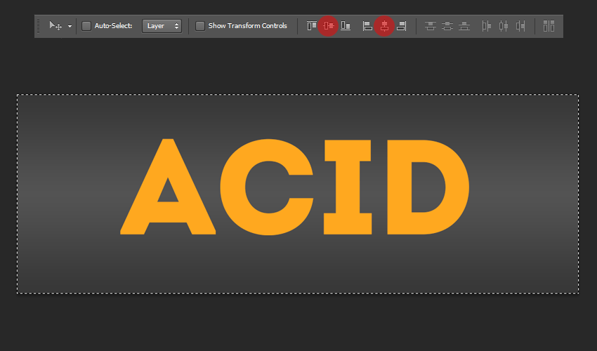 Выберите слой с текстом и нажмите Control-A. Выберите инструмент Move/Перемещение и кликните по иконкам выравнивания по горизонтальному и вертикальному центрам (подсвечены на картинке ниже).