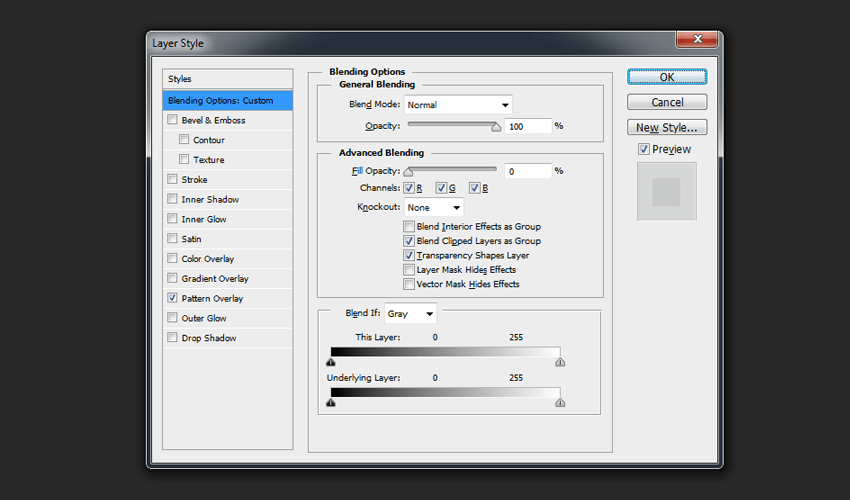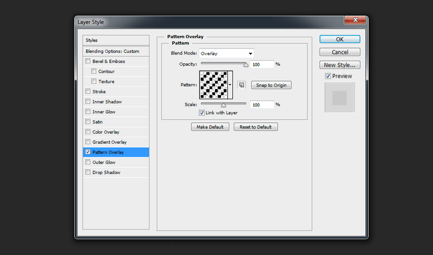 Кликните дважды по слою Text_1, чтобы открыть окно стилей слоя. Укажите стиль слоя Pattern Overlay/Перекрытие узора. Настройте параметры как показано ниже. Кликните по узору и выберите тот что мы создали в начале урока.