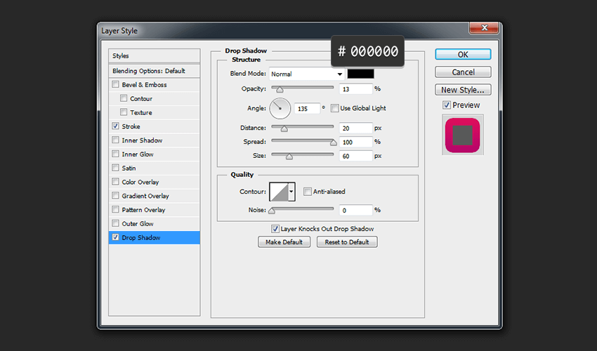 Далее указывайте перечисленные ниже стили слоя с показанными на картинках параметрами.