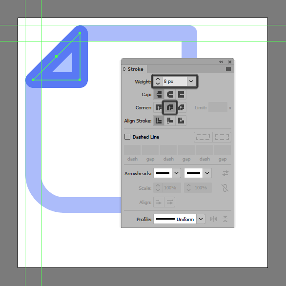 Укажите получившемуся треугольнику обводку цвета #587AF4, толщиной в 8 px и скругленные углы.