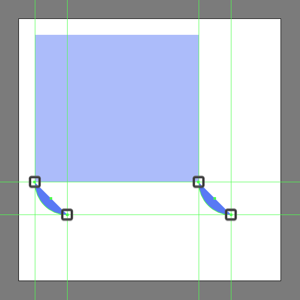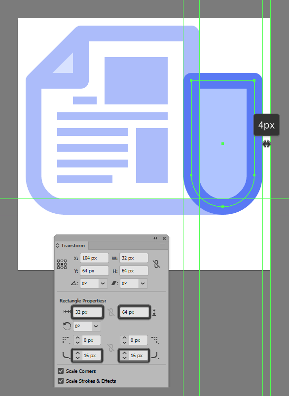 Теперь нарисуем загнутую часть газеты. Для этого нарисуйте прямоугольник размером 32 x 64 px (#B0C5FF). Укажите нижним углам радиус скругления в 16 px. Это можно сделать в палитре Transform/Трансформация в разделе Rectangle Properties/Свойства прямоугольника. Укажите получившейся фигуре обводку толщиной в 8 px (#587AF4). Выделите все объекты и сгруппируйте их, нажав Control-G.