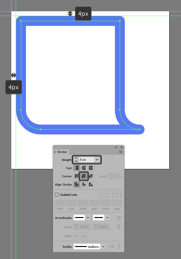Поменяйте местами заливку и обводку, нажав Shift-X. Укажите фигуре толщину обводки в 8 px и скругленные углы, выбрав соответствующую иконку в палитре Stroke/Обводка.