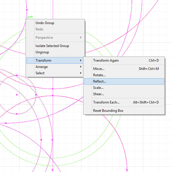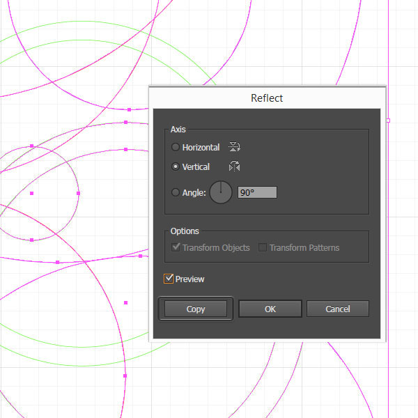 Выделите все круги, за исключением первых двух созданных. Нажмите Control-G чтобы сгруппировать их. Кликните правой кнопкой по группе, выберите Transform/Трансформировать, затем Reflect/Отразить. Выберите Vertically/Вертикально и нажмите Copy/Копия.