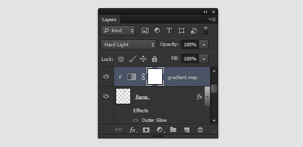 Выберите в меню Layer>New Adjustment Layer>Gradient Map/Слой>Новый корректирующий слой>Карта градиента. Смените Blend Mode/Режим наложения на Hard Light/Жесткий свет и превратите корректирующий слой в маску для пламени (Control-Alt-G).
