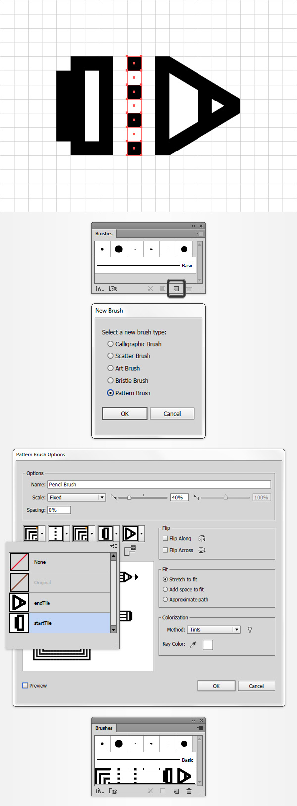 Назовите кисть «Pencil Brush» и настройте ее как показано ниже. Из выпадающего меню выберите в качестве начальной мозаки узор «startTile», а в качестве конечной мозаики — «endTile». После этого нажмите OK и вы увидите свою новую кисть в палитре Brushes/Кисти.