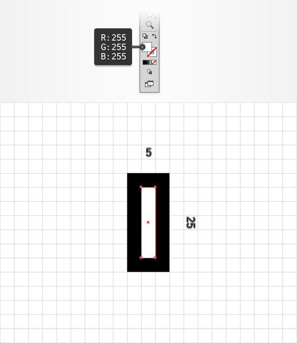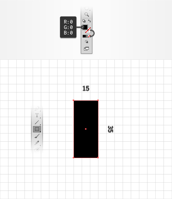 Возьмите инструмент Rectangle/Прямоугольник (M) и обратите внимание на панель настроек. Выберите отсутствие обводки и заливку черного цвета (R=0 G=0 B=0). Переместитесь в рабочую область и создайте прямоугольник размером 15 x 35 px. Сетка и привязка к ней помогут вас сделать это без особого труда.