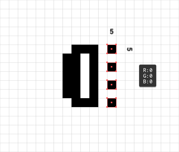 Не меняя инструмент, нарисуйте четыре квадрата с размером стороны в 5 px, и укажите им черный цвет заливки. Разместите квадраты ровно так как показано ниже.
