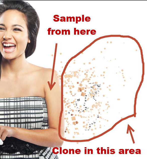 Удерживая Alt, кликните в каком-нибудь месте руки модели, чтобы скопировать образец. Затем начинайте процесс клонирования, рисуя штампом в сторону от модели.