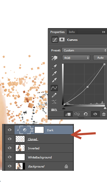 Создайте новый корректирующий слой Curves/Кривые (Layer > New Adjustment Layer > Curves/Слой>Новый корректирующий слой>Кривые). Потяните кривую вниз, чтобы затемнить изображение. Сделайте так, чтобы корректирующий слой действовал только на слой с клонирующим штампом. Для этого, удерживая Alt, кликните между этими двумя слоями в палитре layers/слои.