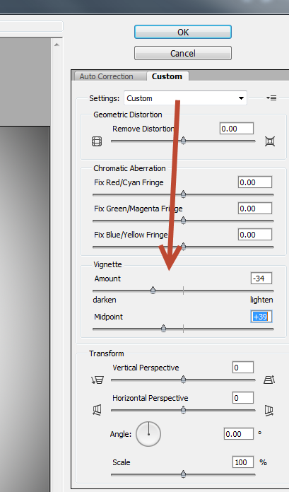 В меню выберите Filter > Lens Correction/Фильтр>Коррекция дисторсии и откройте вкладку Custom/Заказной. Используйте указанные ниже параметры.
