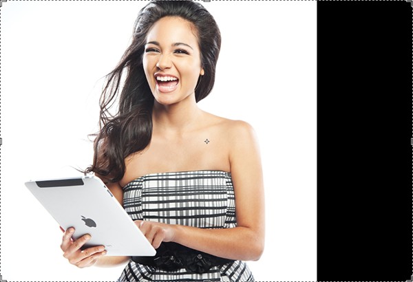 Используйте инструмент Rectangular Marquee/Прямоугольная область, чтобы растянуть выделение по размеру изображения с девушкой, игнорируя черную область.