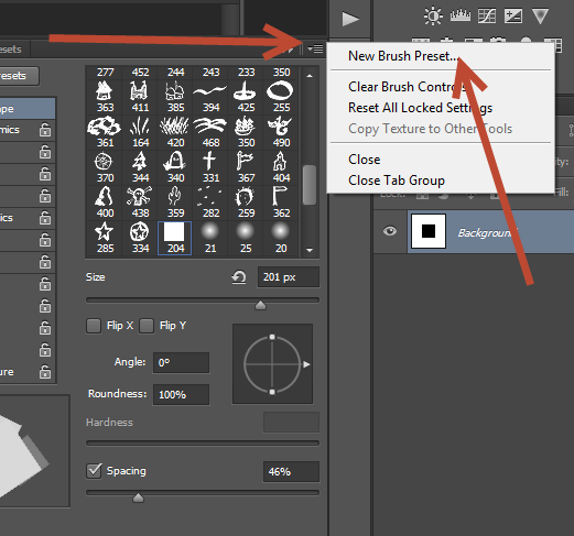 Сохраните кисть, кликнув по маленькой стрелке в палитре и выбрав New Brush Preset/Новый набор параметров кисти. Назовите кисть “Pixel Explosion” и нажмите Оk. Закройте временный документ и вернитесь в основной.
