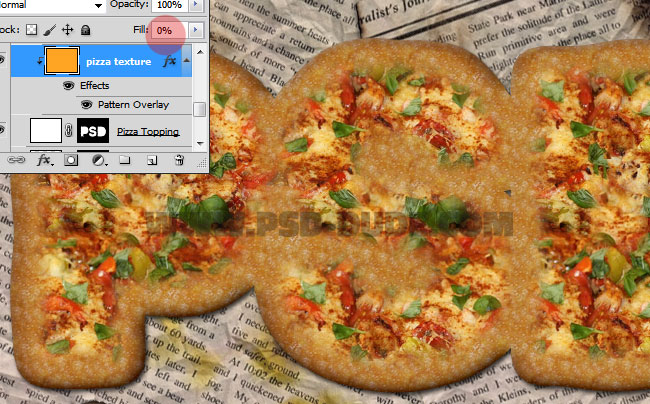 Укажите для слоя Pizza Texture параметр Fill/Заливка в 0%, и укажите слою стиль Pattern Overlay/Перекрытие узора, выбрав один из паттернов «pizza-topping».