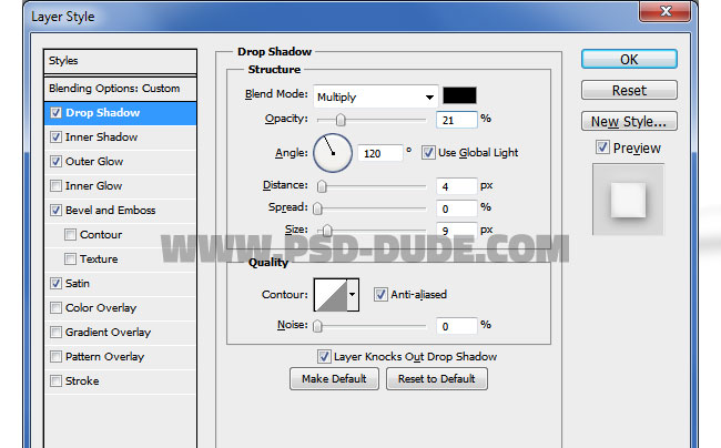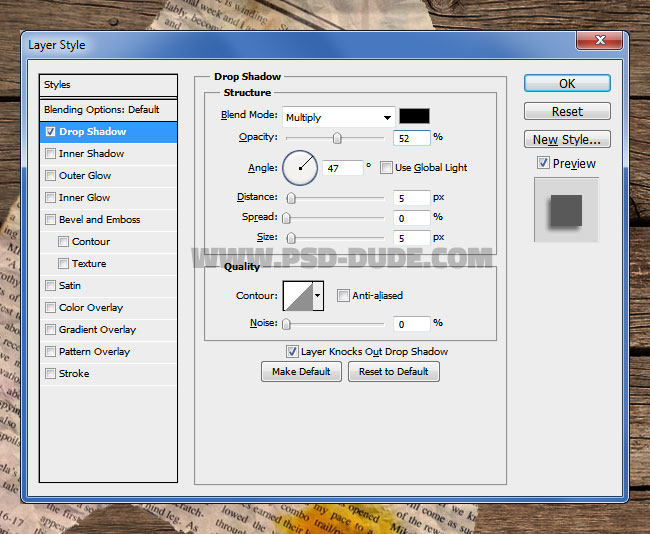 Укажите слою с газетой стиль слоя Drop Shadow/Тень со следующими настройками: