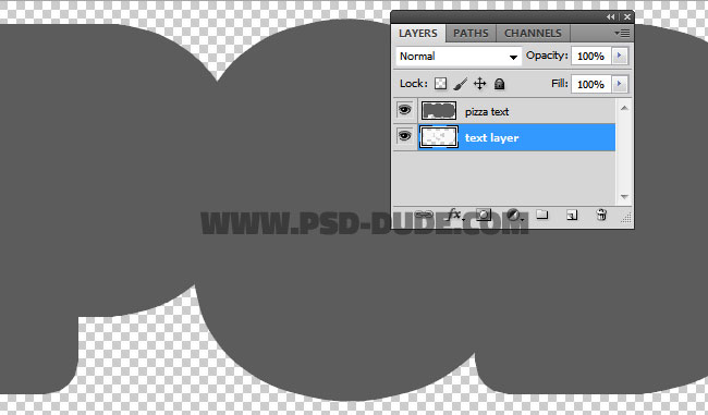 Кликните правой кнопкой по слою с текстом и выберите Rasterize Type/Растрировать слой. Инструментом Paint Bucket/Заливка залейте отверстия в буквах «P»,"D" или других, у которых внутри есть отверстия. Дублируйте слой Text Layer и назовите копию Pizza Text.
