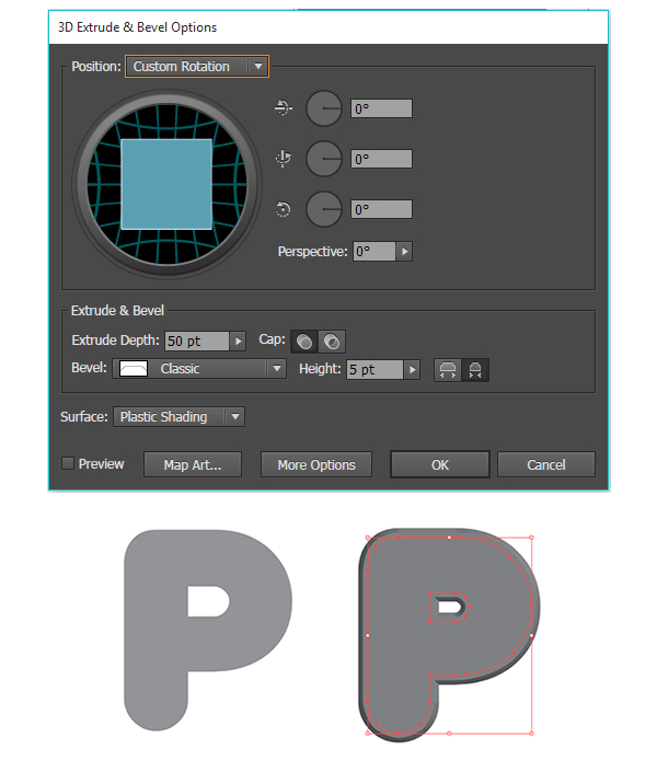 Растяните текст и в палитре Appearance / Оформление залейте его серым цветом. В меню Effect / Эффект выберите 3D> Extrude & Bevel / Объемное изображение >Вытягивание и Скос и установите каждую ось на 0°. Скос задайте классический на 5 pt.