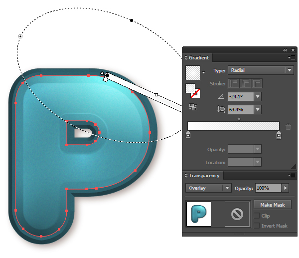 Создайте новую и вашу последнюю заливку поверх всех предыдущих. Задайте радиальный градиент белого цвета, с непрозрачностью от 100% до 0%. В Blending Mode / Режим Наложения выбираем режим Overlay / Перекрытие. С помощью инструмента Gradient / Градиент настраиваем радиус градиента и располагаем центр в верхней части объекта.