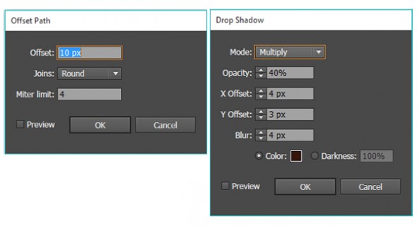 В палитре Appearance / Оформление создайте параллельный контур на 10 pts для этой же заливки (Effect > Path > Offset Path / Эффект > Контур > Создать параллельный контур). Затем добавьте тень Effect > Stylize > Drop Shadow / Эффект > Стилизация > Тень со следующими атрибутами: