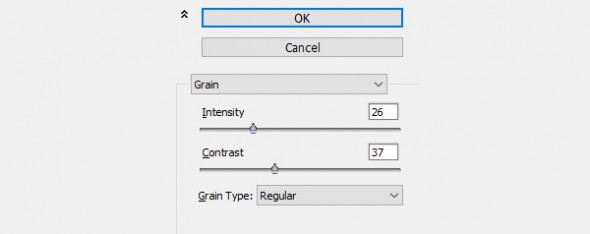 На этой же яркой заливке примените эффект Grain / Зерно с помощью Effect > Texture > Grain / Эффект > Текстура > Зерно и задайте следующие атрибуты: