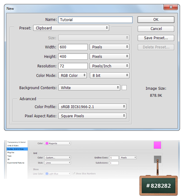 Создайте новый документ размером 600x 400px. В меню выберите View > Show > Grid/Просмотр>Показать>Сетка, а затем выберите View > Snap To > Grid/Просмотр>Привязать к... >Сетка. Нажмите Control + K, чтобы открыть Preferences/Установки окна и откройте вкладку Guides, Grid & Slices/Направляющие, сетка и фрагменты, и укажите параметры как на второй картинке ниже. Сетка поможет вам в работе, однако на скриншотах ниже она выключена ( Control + ‘ ), чтобы вам был лучше виден процесс. Вам же не нужно выключать сетку.