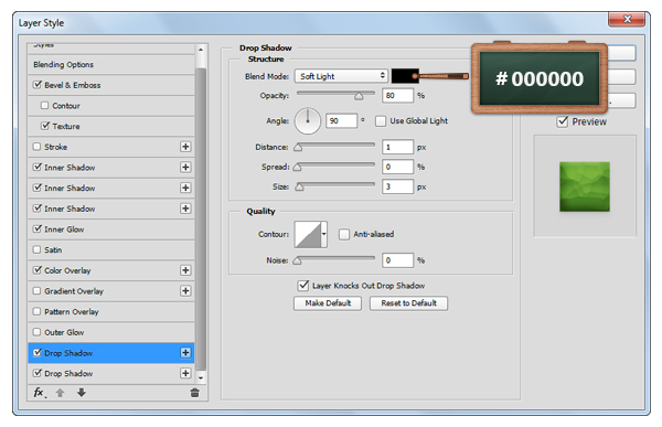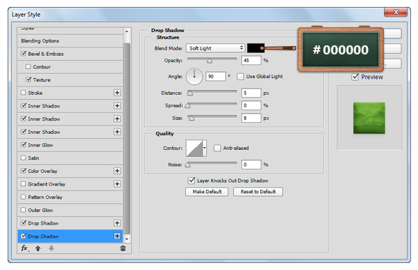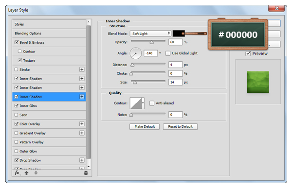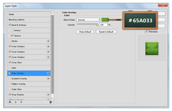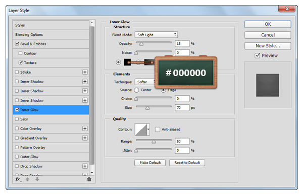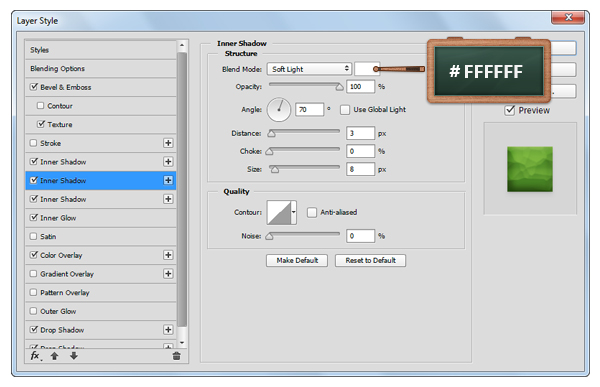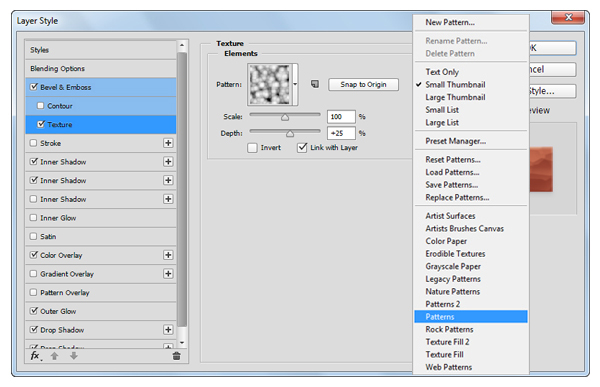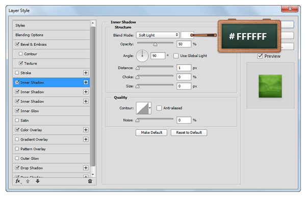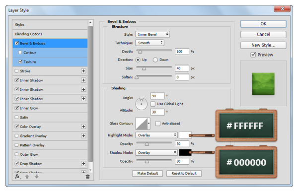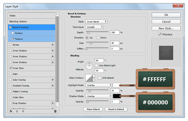 Откройте окно Layer Style/Стиль слоя для только что созданного слоя, и укажите ему следующие стили: