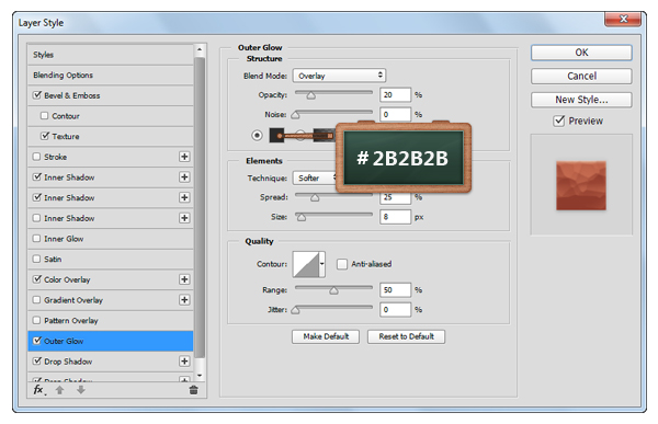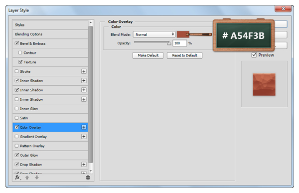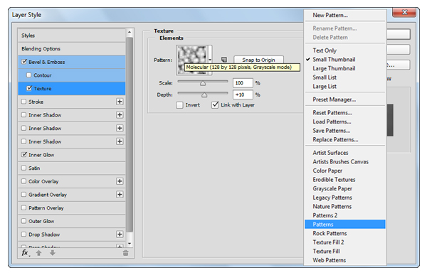 Откройте окно Layer Style/Стиль слоя для нашего слоя, и укажите ему стили слоя показанные ниже.
