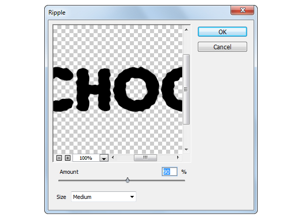 В меню выберите Filter > Distort > Ripple/Фильтр>Искажение>Рябь, укажите степень искажения в 90% и настройте эффект как показано ниже. После чего нажмите кнопку OK.