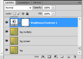Давайте поработаем над тенями и светом. Для начала давайте сделаем фон темнее. Добавьте корректирующий слой Brightness / Contrast /Яркость/Контраст. Поместите его над тремя фоновыми слоями. Укажите Brightness/Яркость в -54 и Contrast/Контраст в +48.