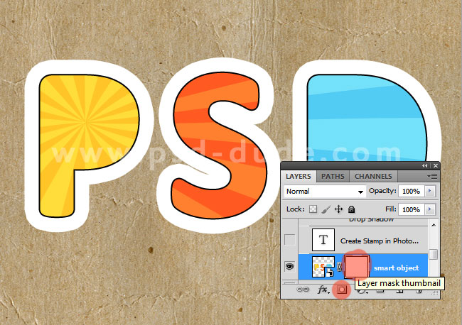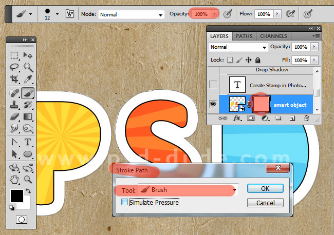 Создайте Work Path/Рабочий контур со слоя с текстовым смарт-объектом. Используя кисть-пунктир, выполните Stroke Path/Обводку контура в маске слоя черным цветом.