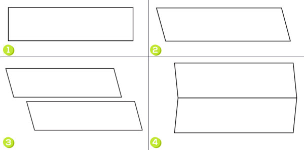 Нарисуйте горизонтальный прямоугольник при помощи инструмента Rectangle/Прямоугольник (M). Инструментом Shear/Наклон скосите прямоугольник влево. Копируйте (Control-C) и вставьте (Control-V) прямоугольник. Отразите копию по горизонтальной оси.