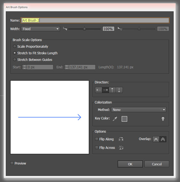 Выделите получившуюся фигуру и в палитре Brushes/Кисти кликните по иконке New Brush/Новая кисть. Выберите вариант Art Brush/объектная кисть и убедитесь что выбрана опция Sretch to Fit Stroke Length/Растянуть и подогнать по длине обводки, а также стрелка направления расположена вдоль объекта.