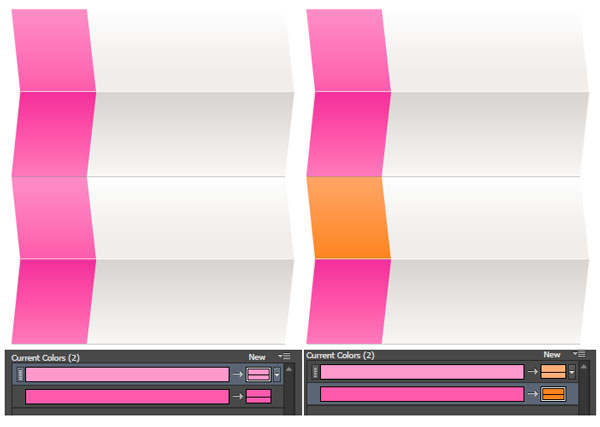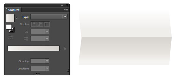 Примените линейный градиент от светло-серого к более темному оттенку серого к обоим прямоугольникам. Растяните градиент так, чтобы верхний прямоугольник был светлее нижнего. Также убедитесь что верхний прямоугольник залит сверху светлым серым, а снизу более темным, а нижний — наоборот. В примере использованы оттенки серого, которые по умолчанию есть в палитре Swatches/Образцы.